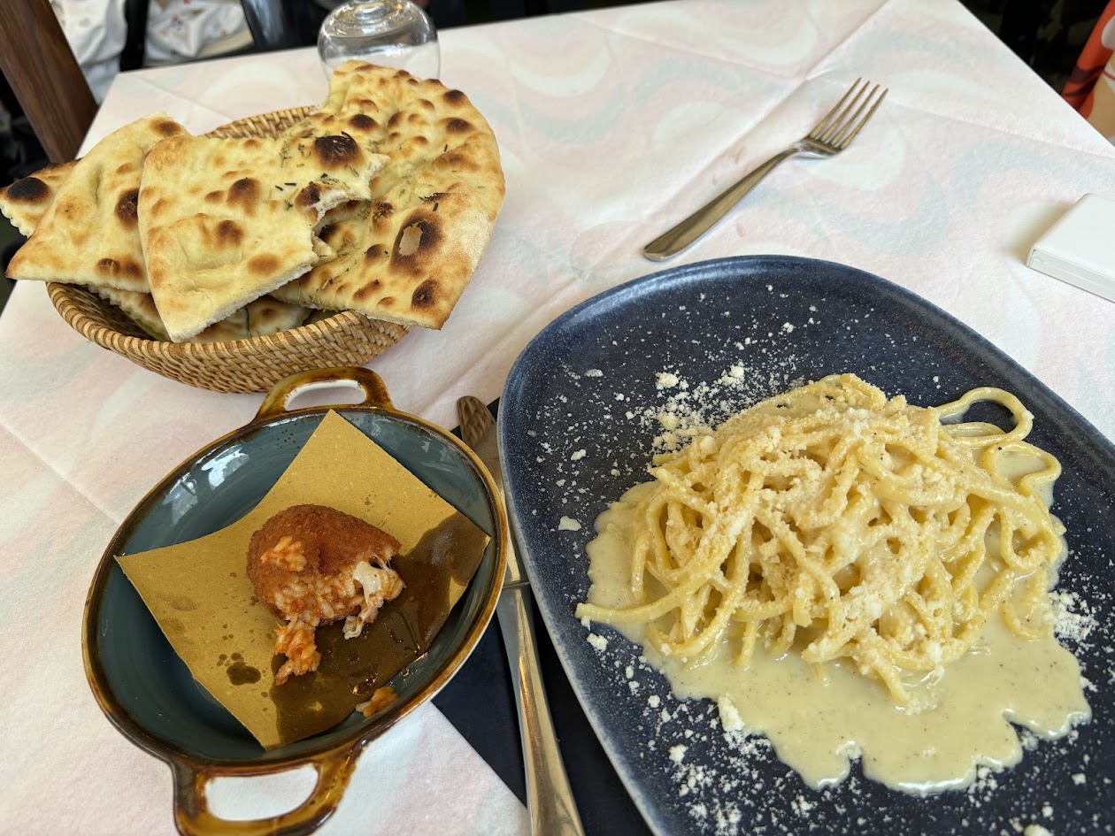 그래서 입맛을 돋울 전채요리로 로마식 주먹밥 수플리를 하나 시키고, 메인 요리로 카치오페페를 주문했다. (어제 먹은 건 카치오페페로 인정할 수 없어...) 그런데 막상 카치오페페가 좀 짤 수도 있다는 생각에 이를 대비하고자 포카치아 빵도 하나 시켰다. (흔한 돼지들의 변명)