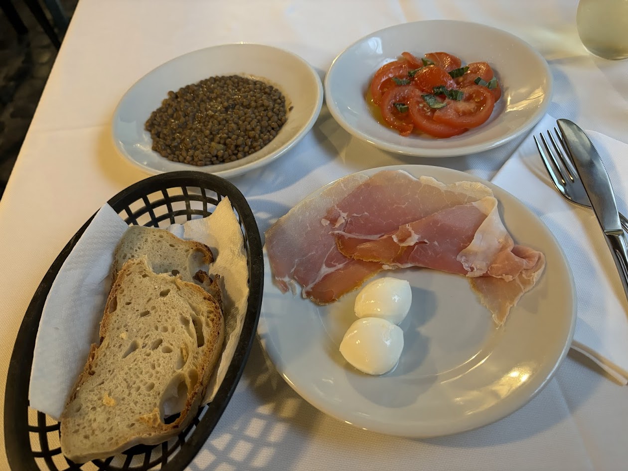 와인 한 잔을 마시며 주위를 둘러보고 있는데 전채요리가 나왔다. 빵과 렌틸콩에 토마토, 모짜렐라치즈와 프로슈트까지. 렌틸콩도 진짜 맛있어서 싹싹 긁어먹었고(뭔들 안 그랬겠냐) 모짜렐라 치즈랑 프로슈토도 너무 맛있어서 빵에다 찍어서 싹 설거지했다.