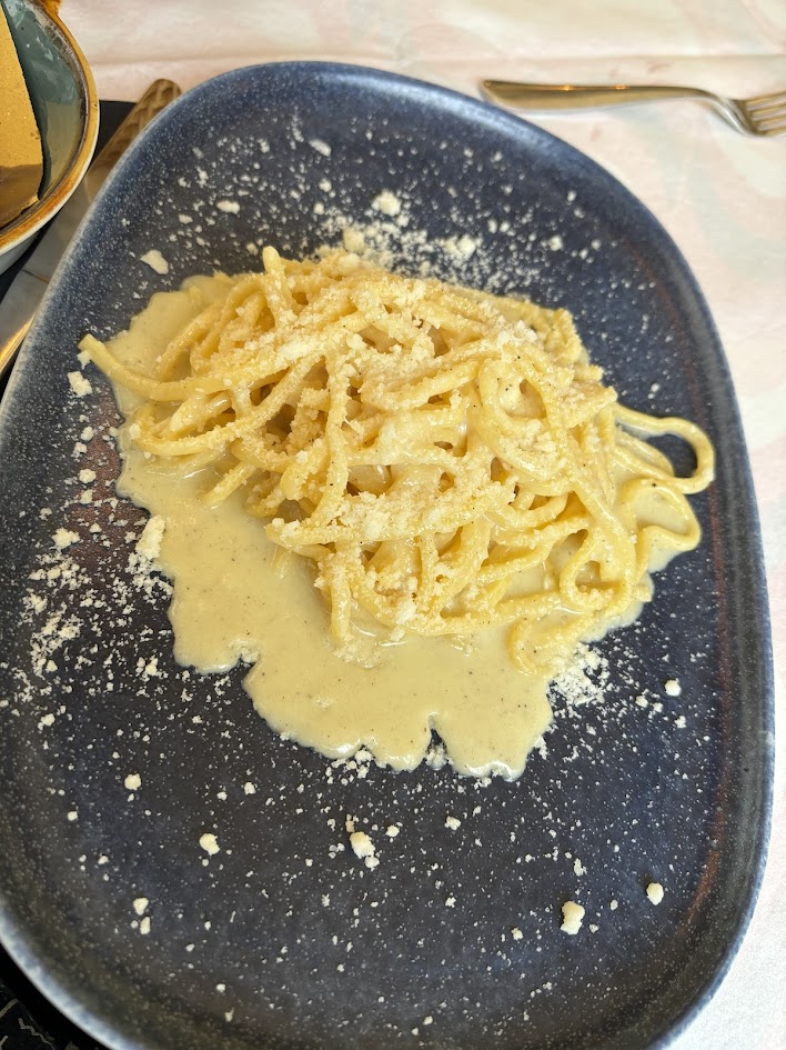 식전주를 마시고 있을 때 차례대로 음식들이 나왔다. 로마식 수플리로 허기를 달래자 이탈리아의 대표적인 빵 포카치아가 나왔다. 그리고 마침내 메인 요리인 카치오페페 등장.
